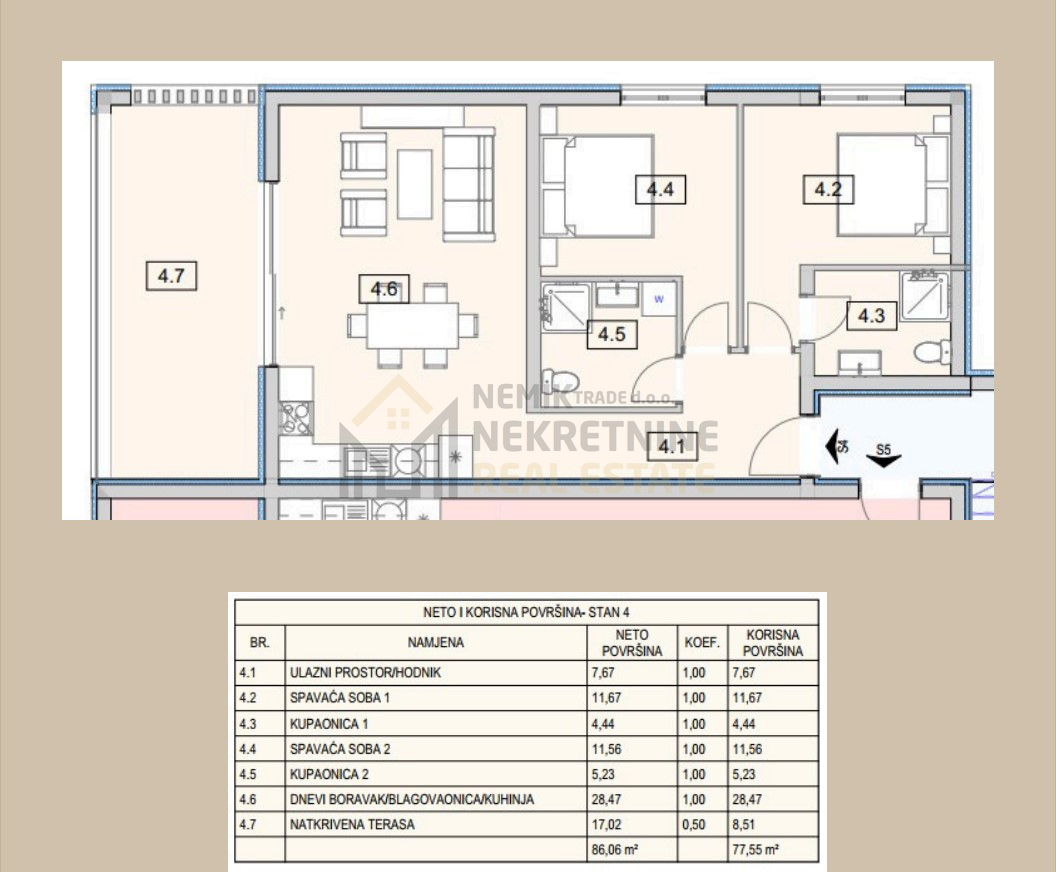 Die Wohnung besteht aus zwei Schlafzimmern und einem Wohnzimmer, die funktional auf der großzügigen Fläche verteilt sind, zwei Badezimmern und einer wunderschönen überdachten Terrasse von 17,02 m2 mit freiem Meerblick.