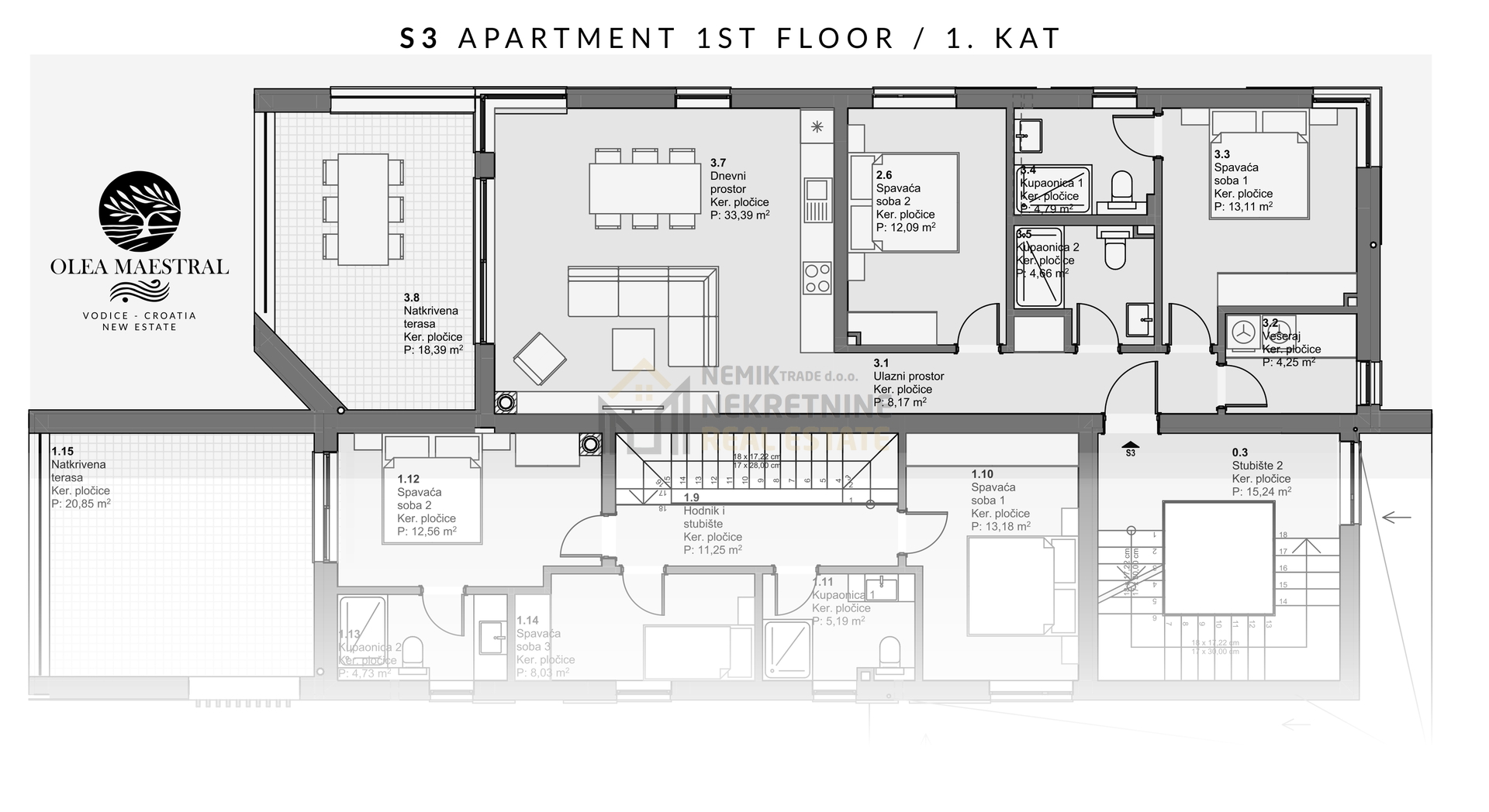 Stan S3 u manjoj stambenoj zgradi sa ukupno 4 stana, nalazi se na 1. katu s kojeg se pruža predivan pogled na more i okolne otoke, ukupne kvadrature od 97,28 m2.